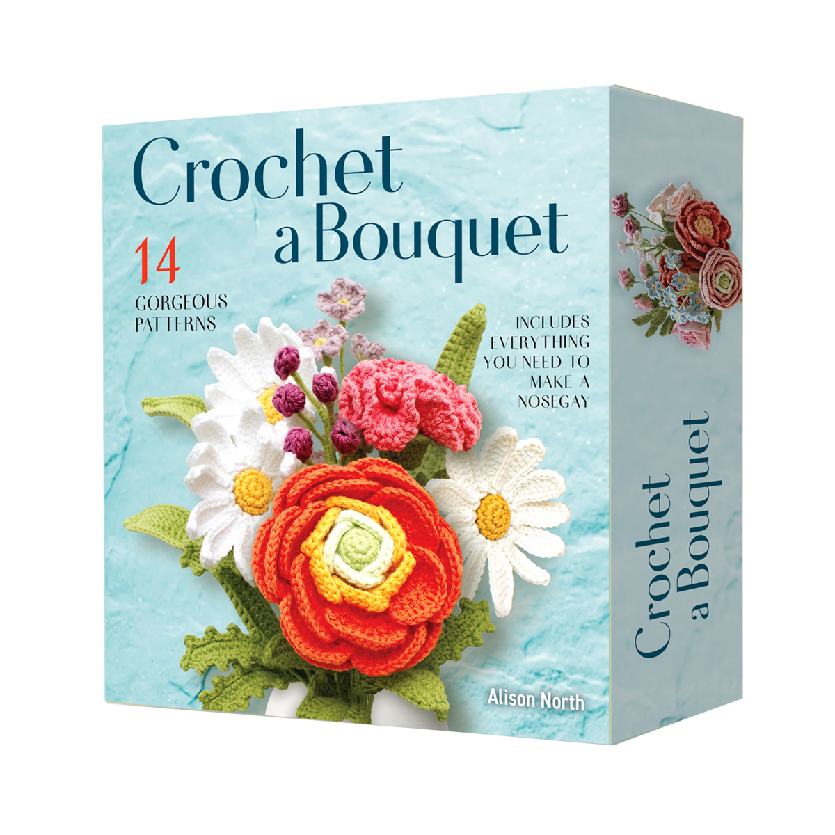 Includes yarn, crochet hook, tapestry needle, floral wire stems, craft wire, and stuffing to make nosegay bouquet.